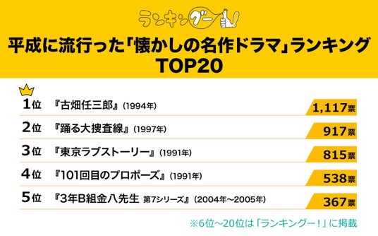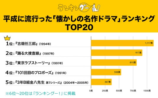株式会社CMサイト(本社:大阪府大阪市、代表取締役社長:柴原 誠治)が企画編集する、「ちょっと気になる」を調べたランキングサイト『ランキングー!(https://rankingoo.net/ )』は、『平成に流行った「懐かしの名作ドラマ」ランキングTOP20』の結果を、投票者のコメント付きで紹介する記事として公開しました。