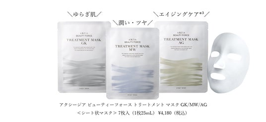 素肌美を追求するため、海の恵に注目した「アクシージア ビューティーフォース」シリーズから誕生した「トリートメント マスク」は、海由来の植物幹細胞エキス 2種類*⁴ × ペプチド 2種類*⁵を3タイプすべてに共通配合。海が宿す力と先進のペプチドサイエンスを、独自の美容理論で融合しました。さらに、各タイプごとに異なる海由来成分とペプチドを複数配合し、お肌悩みにあわせたトリートメントを叶えます。