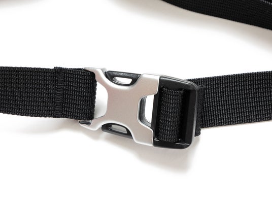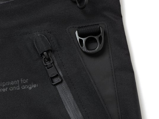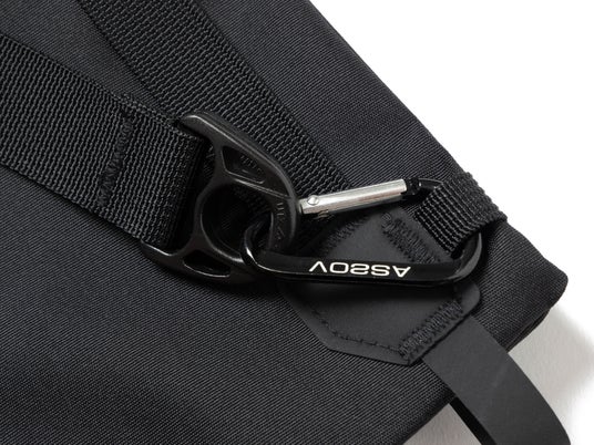 前面にポケット、カラビナなどが取り付けられるパーツを施しており、ファスナーは全て止水ジッパーを採用。