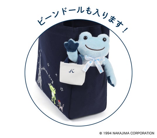 ポケットからちょこんと顔を出しているピクルスと、かたつむりくん、おたまじゃくしのベイビーちゃんがかわいらしいデザインのハンドバッグ。ピクルスの手が実際にポケットから出ているのがポイント。ちょっとしたお出かけに使いやすいサイズ感で、背面側には手書き風のラフなKitamuraロゴ刺繍が入っています。