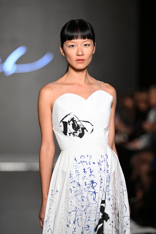 コレクションは静寂の中、“268.416412037”と映し出されスタートし、石川能登半島地震発生からランウェイ当日までの時間経過を視覚的に表現。未だ復興が十分でない被災地の現状に問題提起を投げかけつつも、 復興の兆しへの願いを込めた「白椿」加賀友禅を纏ったモデルがランウェイを進みます。加賀友禅ならではの写実的に緻密に描かれた白椿の美しさや、袖のゆらめきに、観衆は魅了されました。