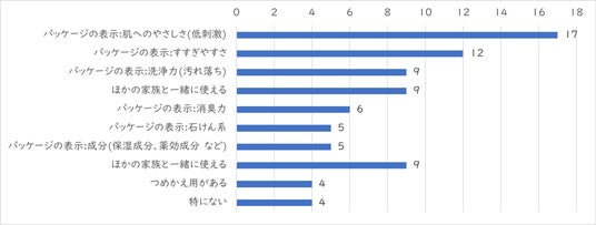 ・入浴サポートに使う洗浄剤を購入したきっかけ(価格以外)は、「パッケージの表示:肌へのやさしさ(低刺激)」、「パッケージの表示:すすぎやすさ」