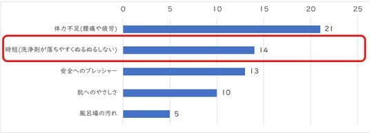 ・入浴サポートに関して解消したいと思う介護者自身の困りごとは、「体力不足(腰痛や疲労)」に次いで「時短(洗浄剤が落ちやすくぬるぬるしない)」