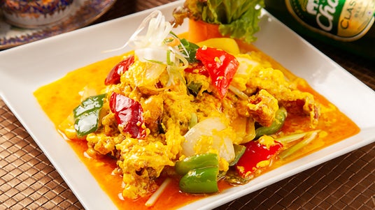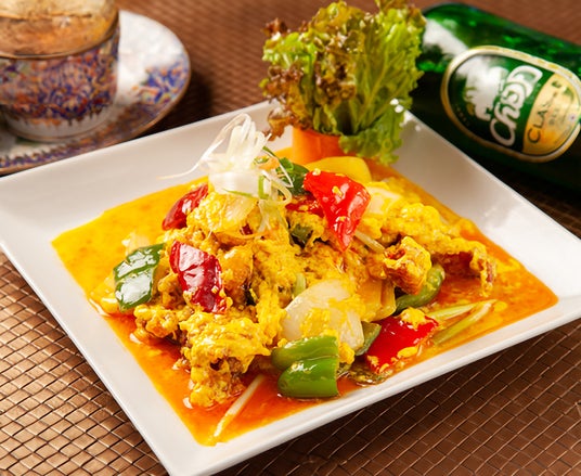 ジャスミンタイでは、揚げたソフトシェルクラブのジューシーな食感と、ふわふわの卵が絡むまろやかなイエローソースが絶妙な一品をお楽しみいただけます。