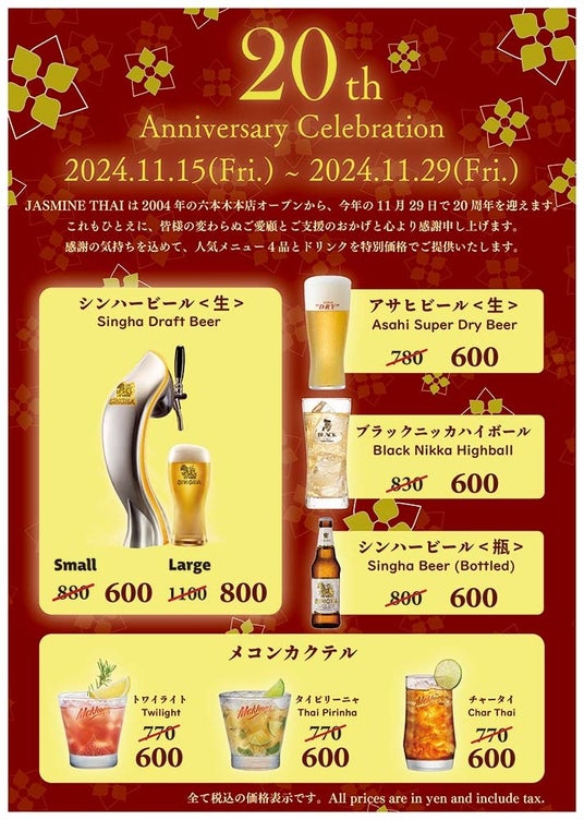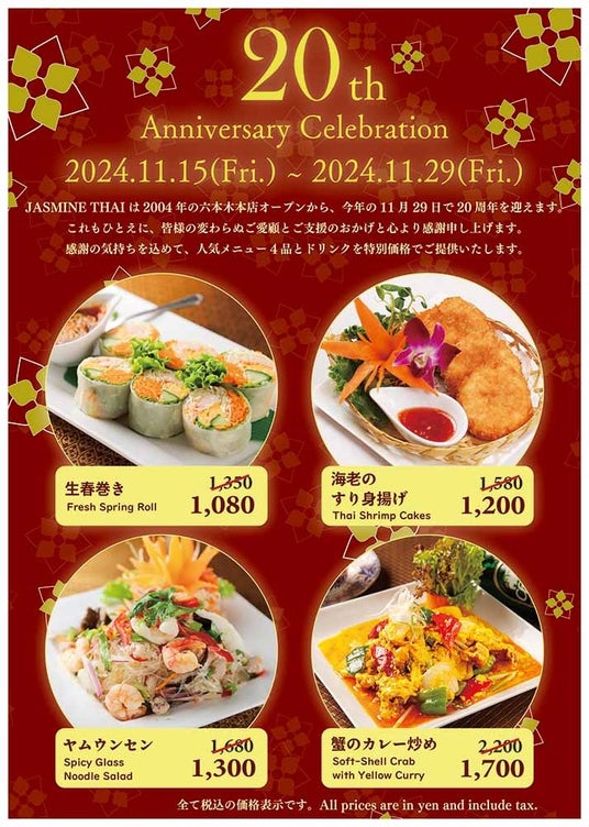 東京都内を中心に「JASMINE THAI」「JASMINE THAI Express」「Thai Street by JASMINE THAI 」等の飲食店を11店舗展開する株式会社JASMINE THAI(本社:東京都港区、代表取締役 高木ドウアンルタイ)は、六本木本店オープン20周年を記念して、ロングセラー商品である人気メニュー4品とドリンクを、2024年11月15日(金)~2024年11月29日(金)まで特別価格にて販売いたします。(※ソラマチ店、日比谷店を除く)