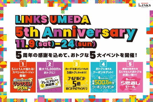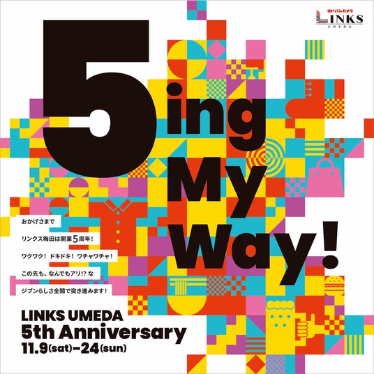 この度、日頃ご愛顧いただくお客さまへの感謝の気持ちを込めて、リンクス梅田の開業5周年祭「5ing My Way!」を2024年11月9日(土)~24日(日)計16日間開催いたします。