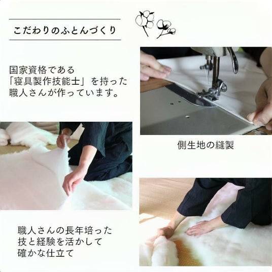 昔ながらの仕立てのお布団は、熟練した布団職人さんの技術によって、カラダ全体のバランスを考え、頭から足の先まで重さの違いを考慮し、オーガニックコットンの綿の配分を考えた絶妙な仕立てになっています。