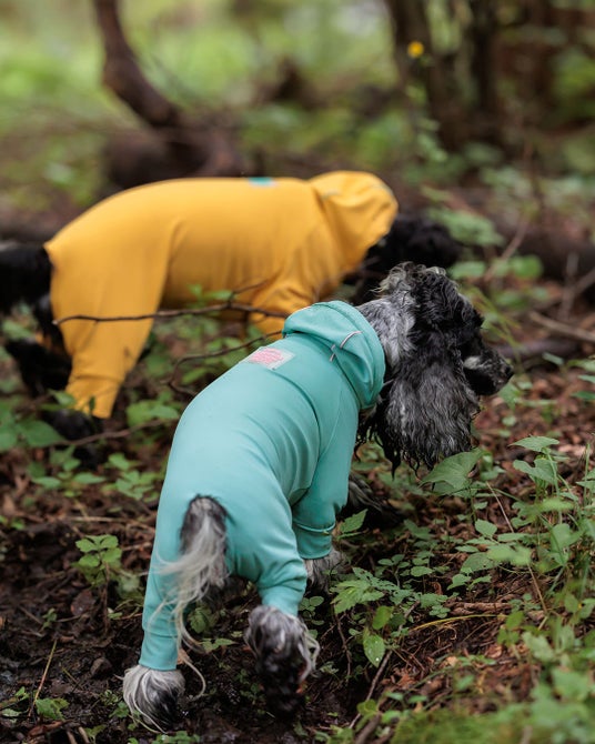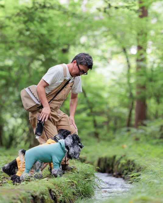 吉野さんが「ウォーターリペレントスキンタイトスーツ」を愛犬に着せて検証してくれたのは、お住まいのある八ヶ岳エリアの大自然の森の中。愛犬はイングリッシュコッカースパニエルのジェナとニーナです。キャンプや釣りなどのアクティビティを犬とともに楽しんでいるそう。