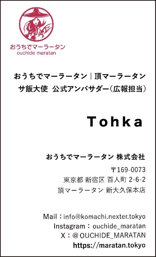 SNSマーケティング事業を行う ネクスター株式会社(本社:東京都 新宿区、代表取締役社長CEO:細田悠巨)のグループ会社である、D2Cブランド事業を行う おうちでマーラータン 株式会社(本社:東京都 新宿区、共同代表 齋藤悠)が運営するD2Cブランド『おうちでマーラータン』( https://maratan.tokyo )は、新大久保に本店を構える『 頂マーラータン 新大久保 本店 』の味をおうちで簡単に味わえるようにした冷凍麻辣湯のヘルシーD2Cブランドです。その公式アンバサダー(広報担当)として、Tohkaが就任し、ネクスター・オフィシャル・パートナーシップ契約を締結しましたことをこちらにお知らせいたします。