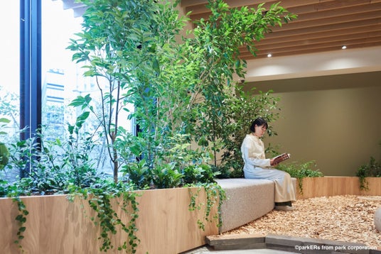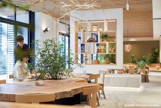「木」の取り組みとして特徴的なものが、2階ラウンジです。植物の専門家と空間デザイナーによりる「公園のようなここちよさ」をデザインする空間デザイン事業部事務所「parkERs」がインテリアを監修します。大木でつくるテーブルは、樹齢160年のスギの元玉をまるごとと樹齢200年のヒノキをそのまま使用したもので、東京都の檜原村で林業を営む株式会社東京チェンソーズが育てた東京都檜原村のと手掛けたものを使用していまです。東京チェンソーズが所持する東京都檜原村から届いたものを使用しています。また、ラウンジ内の緑化にも注力しており、森で見られる木々の連なりや切り株から芽生えた命といった、自然の中で感じられる要素を随所に散りばめデザインしております。樹木の使用部分や産地等、木にまつわるエピソードを視覚的に伝えるサインも設置しております。温もりを感じる木のをそのまま使用した家具や植物木々と触れあうことで、自然への感受性を高め、五感を使って楽しむることができる心地よい日常体験を提供いたします。
