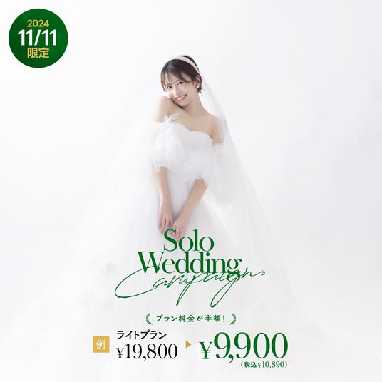 11/11は『独身の日』。いま話題の”ソロウエディング”プランが、この日のご契約のみ半額の¥9,900(+税)!おひとりはもちろん、友達同士でも、気軽にドレス姿を楽しみませんか。