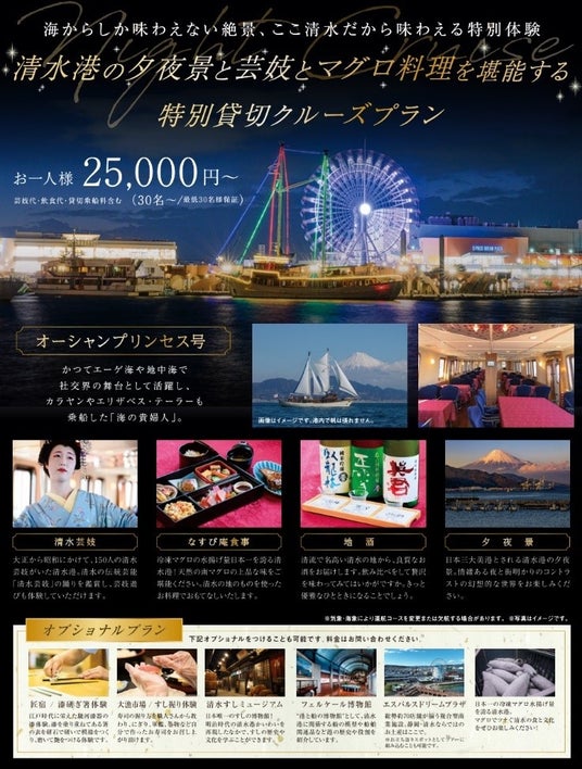 ■清水港の夜景と芸妓とマグロ料理を堪能する、帆船オーシャンプリンセス号特別貸切りクルーズプランおひとり様25,000円(税込)~