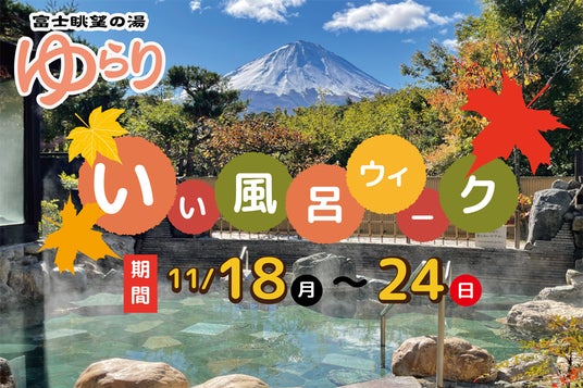 富士山麓にある富士眺望の湯ゆらりでは、11/18~24の期間、「いいふろ」に因んだ特別企画「いい風呂ウィーク」を開催。期間中は、LINEの友だち限定特別プランや期間限定定食などをご用意しております。