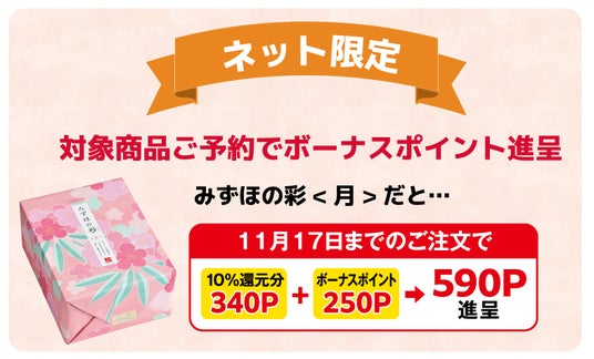 さらに今年は、2024年11月17日(日)までのささら屋オンラインショップのご注文については上記の早得キャンペーンのポイントに加えて「ネット限定ボーナスポイント」も特別進呈いたします!
