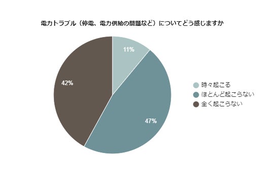 電力トラブルについて調査したところ「ほとんど起こらない」が47%、「全く起こらない」が42%と、合わせて約9割が電力トラブルについて起こりづらいと感じているようです。