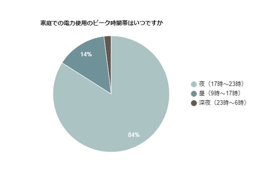 家庭での電力使用のピークを調査すると、17時~23時の夜間帯が84%と多い結果となりました。