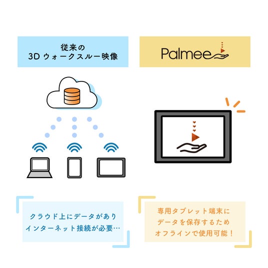 不動産業界で多く使われている3Dウォークスルーの映像は、その多くがインターネット回線を必要とするWEB限定のサービスでした。我々が開発したPalmeeは、独自アプリの開発によりタブレット端末のみ・インターネット回線不要での利用を可能にしています。どんな年齢層の人でも、どんな環境下でも、Palmeeさえあれば等しく想い出の追体験ができる。どこでも、誰もが、想い出の場所を思うがまま巡ることができる、そんなサービスです。