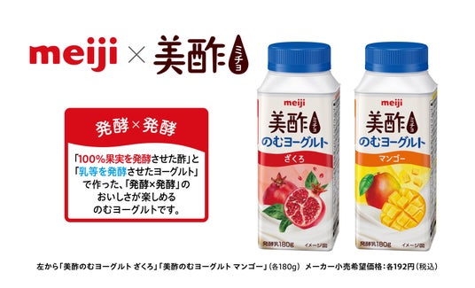 ビネガードリンク市場No.1の「美酢」*1とヨーグルト市場No.1の明治*2が初のコラボ!「100%果実を発酵させた酢」と「乳製品を発酵させたヨーグルト」でつくった、2種類の発酵食品の組み合わせで、ヨーグルトのまろやかさと美酢のフルーティーなあじわいが絶妙にマッチ。美酢(希釈式)のアレンジ方法としても大人気の美酢xヨーグルトの組み合わせを、絶妙なバランスですぐにお楽しみいただけるコラボ商品です。