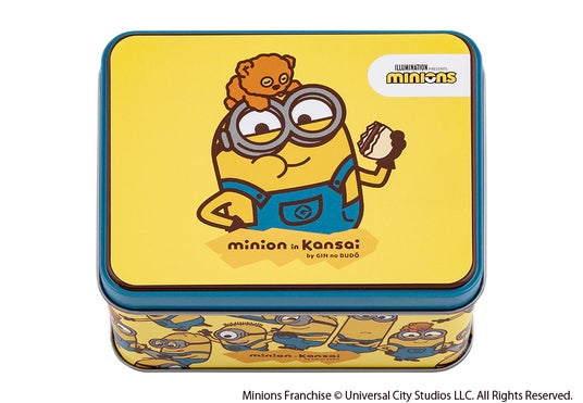 お菓子だけではなく缶のいたるところまで、お茶目なミニオン缶のデザインにも注目!スウィーツ大好き、バナナ大好きなボブがクッキーサンドをもぐもぐしている「ミニオンinカンサイ」だけのオリジナルデザインです。蓋はもぐもぐ中のボブと大好きな相棒のティムも一緒。側面には表情豊かなミニオンたちが大集合!缶もお菓子にもミニオンが大量発生中のクッキーサンドをぜひ召し上がれ!