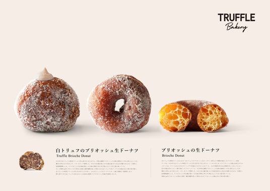 口の中で白トリュフ専用のクリームと共に溶け合う仕上がりに。内容は通常ブリオッシュでは卵の使用を10%に抑えるところを贅沢に39%まで引き上げ、バターをリッチに使用した商品です。白トリュフの生ドーナツの生地はまるで飲み物のように、白トリュフの専用クリームと共に口の中でとろけあい、ふんわりしっとり生ドーナツとは一味違う体験をご提供します。