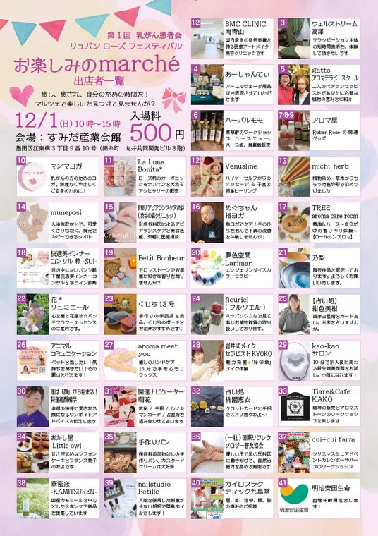イベントでは、多彩なワークショップや講演会、体験型アクティビティを通じ、乳がんに関する最新情報を学びながら、日々のケアや生活に役立つ知識を深めることができます。特に、アロマセラピーやハーブ療法、ヨガといった心と身体の健康をサポートするセッションが充実しており、リラックスした雰囲気の中で健康的な生活への第一歩を踏み出せる機会が提供されます。