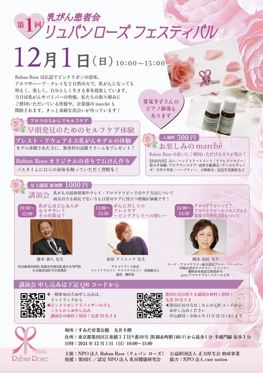 乳がん患者やそのご家族、また乳がんに対する理解を深めたい方々が集まるイベント「Ruban Rose フェスティバル」が開催されます。本フェスティバルは、乳がんに関する知識や最新の治療情報を共有し、患者やその家族が豊かに日々を過ごすためのヒントを提供することを目的としています。