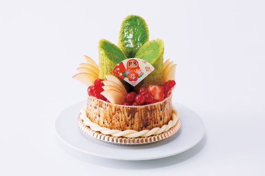 【内容】抹茶ホワイトチョコレートガナッシュを包んで門松の竹を表現。ホワイトチョコレートで作った土台の中にアプリコットジャムをサンドしたスポンジ、トップにりんごやベリーを飾り、華やかに仕上げました。