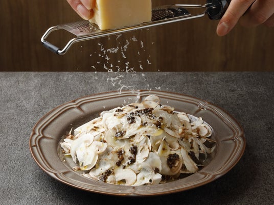 ~トリュフドレッシング~鮮度が決め手のマッシュルームのサラダに、たっぷりとチーズを振りかけて仕上げます。