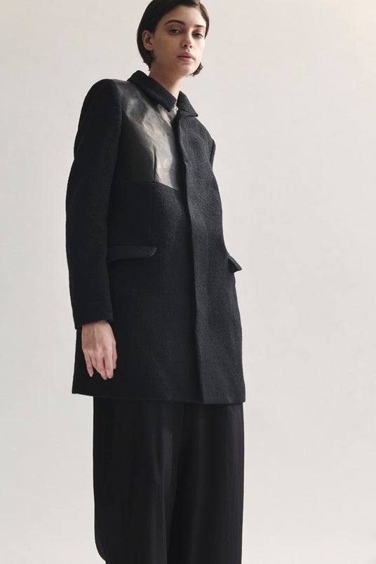 比翼レザー切替ジャケット ¥187,000(税込)ヨーク切替フレアパンツ ¥66,000(税込)