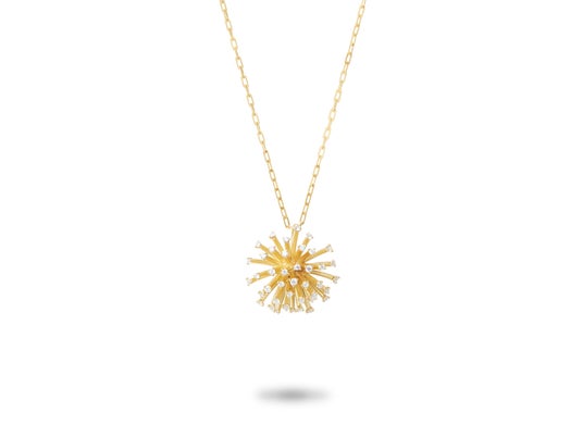 ダイヤモンドを頂点に据えた立体的で印象的なデザインのペンダント。