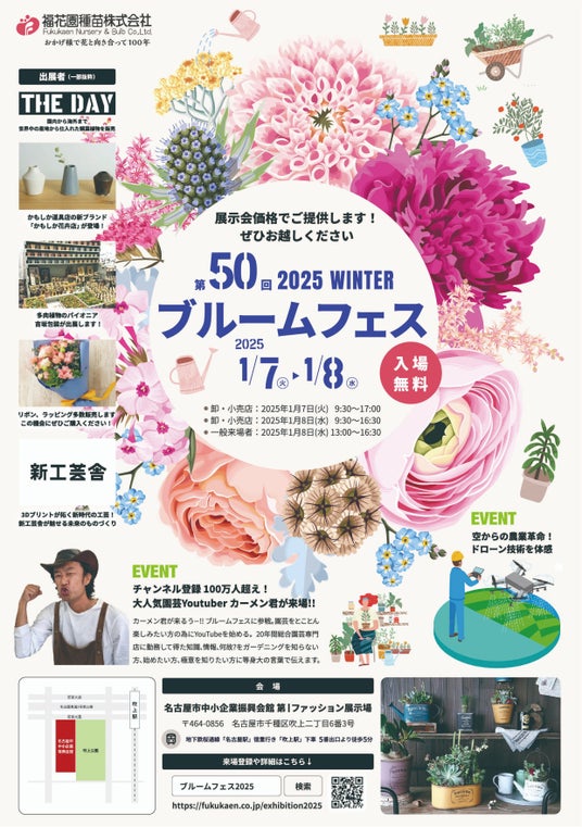 福花園種苗株式会社(本社:愛知県名古屋市、代表取締役社長:吉田俊大)は、2025年1月7日・8日の2日間、「第50回ブルームフェス2025 冬 名古屋」を名古屋市中小企業振興会館 吹上ホール(第1ファッション展示場)にて開催いたします。2日目には一般のお客様もご来場いただけます。この機会にぜひお越しください。