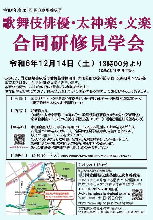 国立劇場養成所では、12月14日(土)に歌舞伎俳優研修、大衆芸能(太神楽)研修、文楽研修への応募希望者を対象とした合同研修見学会を開催いたします。