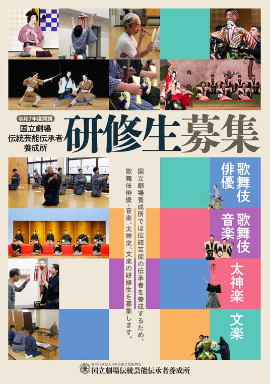 国立劇場養成所では伝統芸能の伝承者を養成するため、以下の研修生を募集しています。