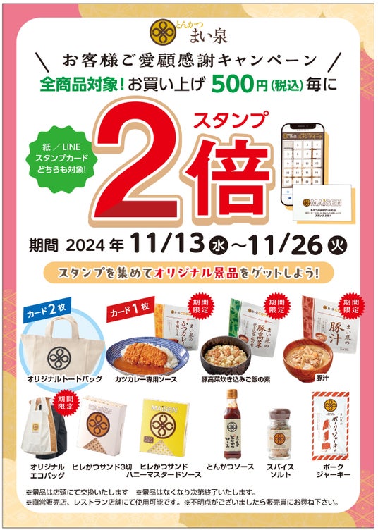 井筒まい泉株式会社(本社:東京都港区、代表:國弘 克英)は11月13日(水)より「まい泉スタンプ2倍キャンペーン」を実施します。
