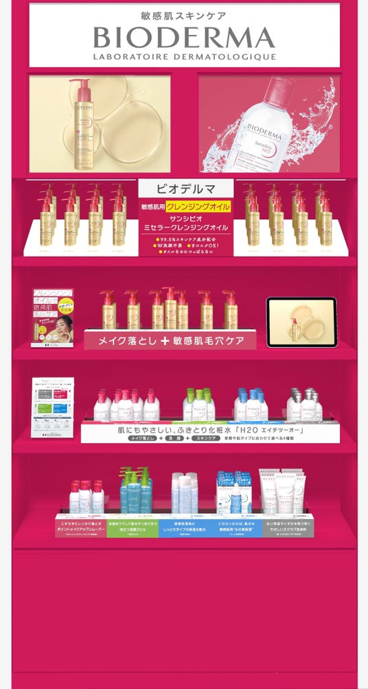 今春発売された敏感肌*¹のためのクレンジングオイル「サンシビオ ミセラー クレンジングオイル」を中心に、「サンシビオ エイチツーオー D」など、ビオデルマの代表製品を多数取り揃えて販売いたします。