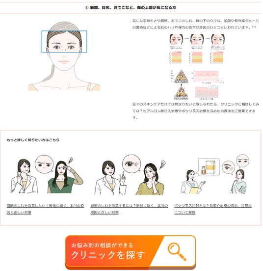 こうした状況を背景に、アラガン・エステティックスは「いい(11)とし(14)」(いい歳)と読む語呂合わせから、11月14日に合わせ「クリニックで話そう、しわ・たるみ、肌のこと。」キャンペーンを実施します。キャンペーンページでは、眉間や目尻のしわ、ほうれい線など様々な肌悩みの原因について知ることができるほか、お悩み別のクリニックを検索できます。