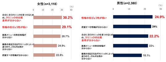 一方で、美容医療に関する情報で多くの人が「自分に合うクリニックを見つけるための、クリニック比較基準が分からない」(女性第1位、男性第3位)、「情報の信ぴょう性が低い」(女性第2位、男性第1位)といった不便さを感じています1。実際に美容医療を検討する際に、自分の悩みを改善できるクリニックを選ぶことの難しさを多くの人が感じている実態が浮き彫りとなりました。