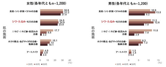 全国の15~69歳の男女13,200人を対象とした美容医療に関する意識調査によると、今後やってみたい美容医療の肌の施術では「しわ・たるみ・毛穴の治療」が30~50代で男女とも第2位に挙げられました(※1)。この結果から、「しわ・たるみ」は性別を問わず、30代以上の男女にとって共通の肌悩みであることが伺えます。