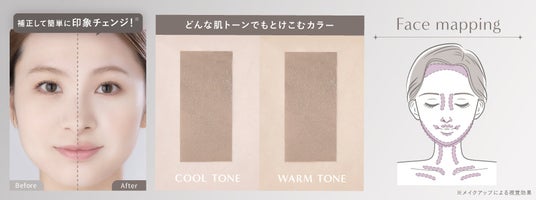 “生まれ持った骨格に見える自然なシェーディング効果※”“どんな肌トーンでも色浮きせずにお肌になじむ”“長時間つけていてもくすまずお肌の透明感をキープ”、そんな欲ばりを叶える、くすみをとばすほんのりブルーを配合した赤みや黄みのないグレージュカラー。自然に小顔を演出し骨格を補正※。