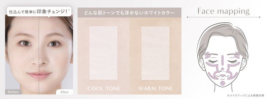 “テカリに見えない自然なハイライト効果”“どんな肌トーンでも色浮きせずにお肌になじむ”“長時間つけていてもくすまずお肌の透明感をキープ”、そんな欲ばりを叶える、数滴ピンクを混ぜたホワイトカラー×パール・ラメ無配合のマットハイライト。自然にリフトアップを演出し骨格を補正※。
