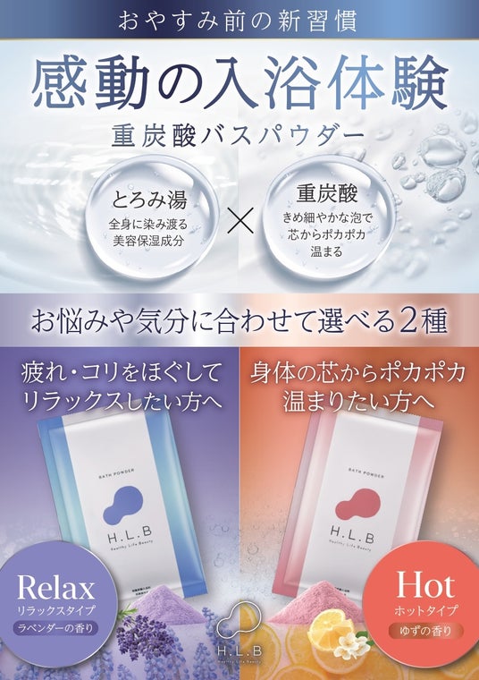 H.L.Bバスパウダーの「重炭酸美容入浴」で優雅なリラックスタイムを誘います。