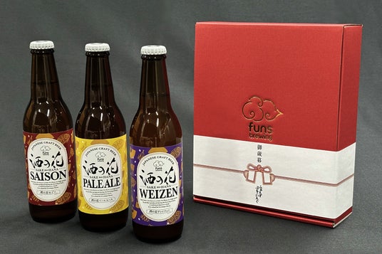 さらに、「酒の花クラフトビールで乾杯!でご縁をつなぐ」をコンセプトにデザインしたオリジナル水引紙をご用意しました。funsbrewingのECサイトのカートページで「ギフト配送を希望する⇒のし紙」にチェックしてご購入いただくと、化粧箱にオリジナル水引紙を貼ってお届けいたします。水引の上下に「御歳暮」 「御年賀」や「送り主のお名前」を印字することも可能です。