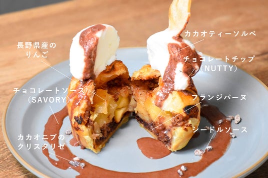 さらにアップルパイの上には、ガーナ産のカカオニブをミルクにつけ香りを移したカカオティーソルベを載せています。温かいアップルパイを楽しんだあとは、ソルベと合わせてひんやり&あつあつの味わいをお楽しみいただけます。