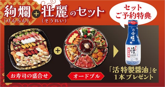 豪華なお寿司の盛り合わせ「絢爛(けんらん)」とボリューム満点オードブル「壮麗(そうれい)」のセット!