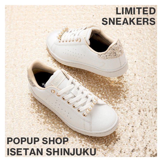 プラスダイアナ秋冬の新作や定番人気のアイテムの他、POPUP SHOP限定スニーカーを数量限定でご用意しております。パールのシューアクセサリーとグリッターが、ラグジュアリーでスペシャルな1足です。是非お立ち寄りください。