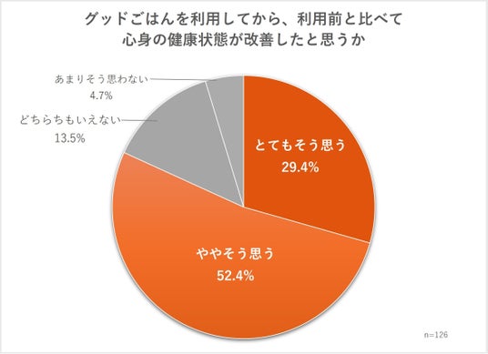 さらに、同調査において、「グッドごはんを利用する前と比べて心身の健康状態が改善したと思う(とてもそう思う・ややそう思う)」と回答した人は8割を超えました。