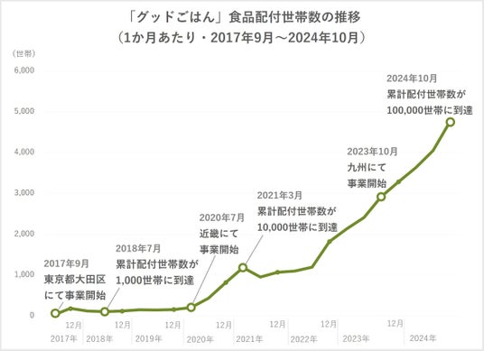 2017年9月の事業開始以降、食品の受け取りを希望する家庭は増加し続け、2024年10月までにおける食品配付世帯数はのべ10万世帯に達しました。
