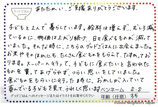 「(食品を)いただけるので、家計が助かった。その分を子ども達の衣服や筆記用具、誕生日祝い・クリスマスプレゼントにまわす事が出来た」