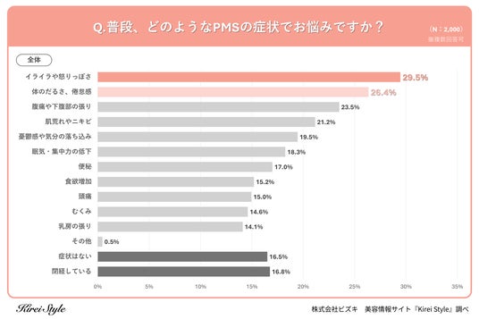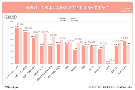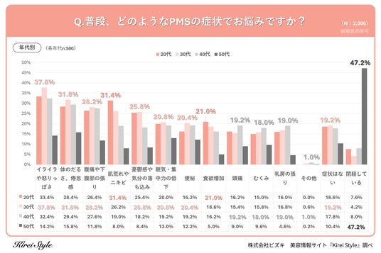 「今のキレイも、10年後の輝きも」をコンセプトに美容や健康にまつわる情報を発信する「Kirei Style(キレイスタイル)」の運用を行う株式会社ビズキは、全国の女性2,000人を対象にPMSに関するアンケートを実施し、年代別等の特徴についてまとめました。