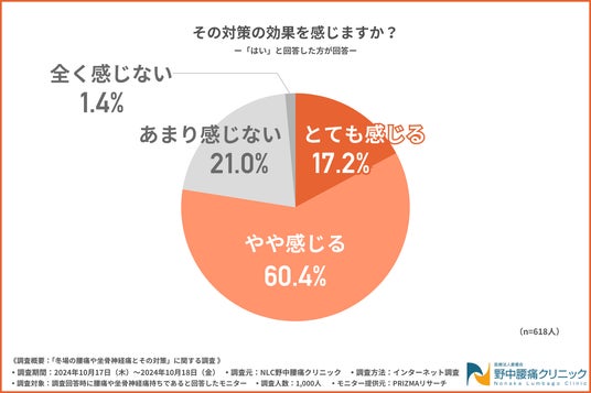 今回の調査で、腰痛が悪化しないように対策を行っている方は6割以上おり、その対策の効果を約8割の方が感じていることが明らかになりました。